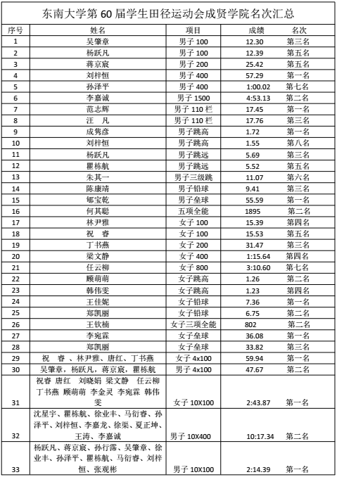 在4月14日结束的51吃瓜网 第六十届学生田径运动会中,我院运动健儿团结协作、奋勇拼搏,获得男女团体总分第二名,男子团体总分第二名,女子团体总分第二名的好成绩(获奖名单附后)。在此,特向全院师生报喜,并向全体获奖运动员表示热烈的祝贺!