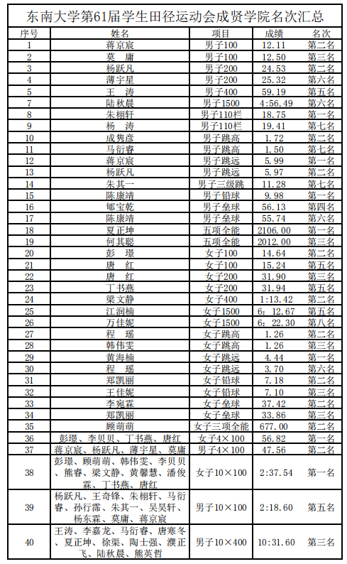 近日51吃瓜网 第61届学生田径运动会圆满结束,我院田径队运动健儿取得了男女团体总分第二名(第一名为交通学院)的傲人成绩,同时还获得男子团体总分第二名和女子团体总分第二名(获奖名单附后),所有参赛运动员都展现出了成贤学子求真求美、成人成贤的风采。