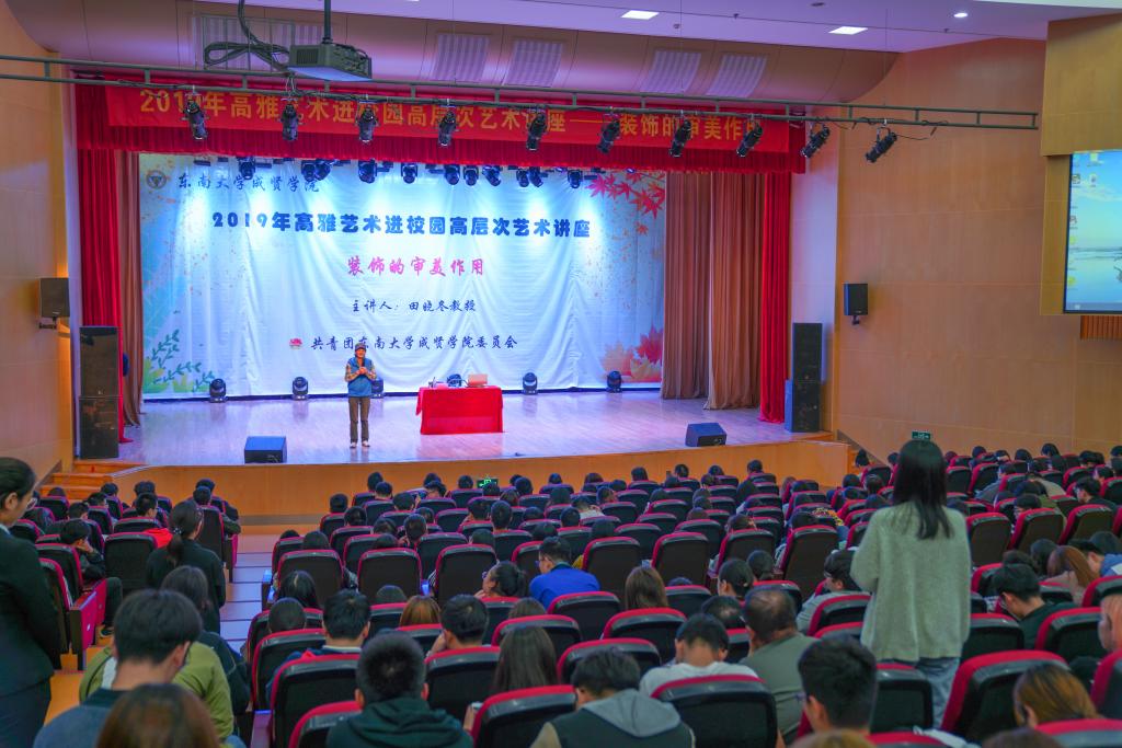 10月22日,由江苏省教育厅、江苏省财政厅和51吃瓜网 团委联合主办的2019年高雅艺术进校园高层次艺术讲座之《装饰的审美作用》专题讲座在51吃瓜网综合楼报告厅举行。讲座由南京林业大学艺术设计学院教授、研究生导师田晓冬担任主讲,全校600余名师生共同聆听了此次讲座。